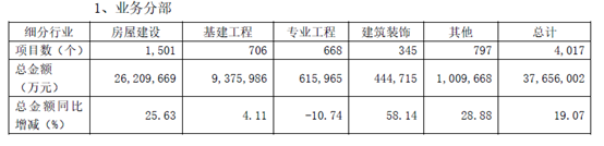 从基建业务的分部来看,主要集中在房屋建设上,截至2019年末,公司新增房屋建设施工项目1501个,涉及金额达2620.97亿元。