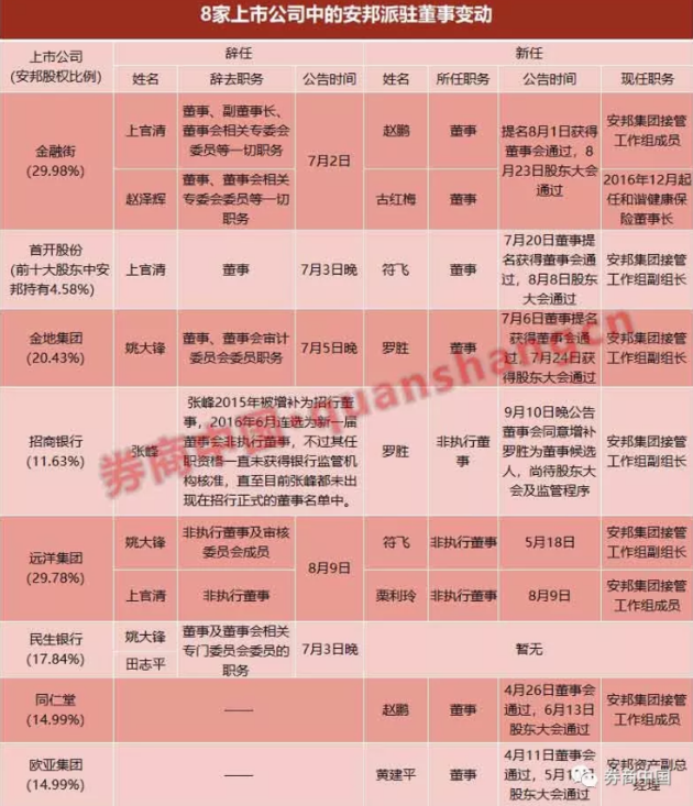 至此,安邦重仓的上市公司,已有8家出现安邦派驻的董事发生变更情况。除招行外,其余7家包括金融街(6.680, -0.02, -0.30%)、首开股份(6.780, 0.01, 0.15%)、金地集团(8.590, -0.03, -0.35%)、远洋集团、同仁堂(30.040, 0.04, 0.13%)、欧亚集团(20.580, -0.05, -0.24%)、民生银行(5.860, -0.04, -0.68%)。(券商中国此前曾报道,《安邦系董监高大撤退!不止民生银行,4家上市公司安邦系董监高辞职》)