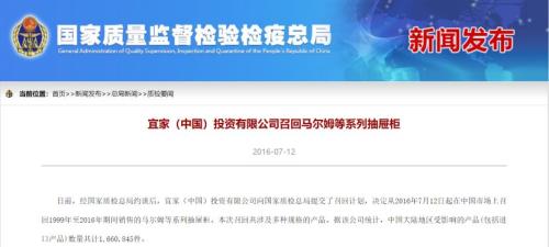 2016年7月12日,国家质检总局官网宣布,经约谈后,宜家(中国)投资有限公司向国家质检总局提交了召回计划,决定在中国市场上召回1999年至2016年期间销售的马尔姆等系列抽屉柜。本次召回中国大陆地区受影响的产品(包括进口产品)数量共166万件。