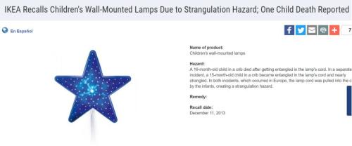 宜家最早宣布召回这款儿童灯具,是因为一名17个月大的婴儿窒息死亡。