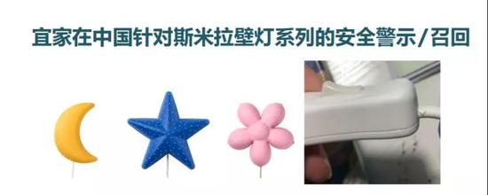斯米拉·布洛玛壁灯 图片来源:宜家官网2013年12月,宜家决定召回这批自1999年以来一直在店内销售的壁挂式灯具 。这批被召回的灯具包含八种设计类型:包括蓝星、黄月亮,粉红花、白花、红心、绿虫、蓝贝壳和橙色海马。