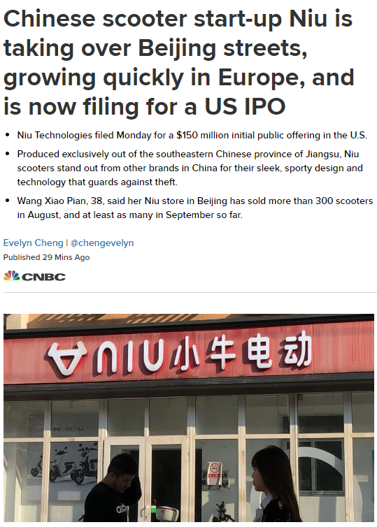 小牛电动(Niu Technologies)周一在美提交了1.5亿美元的公开募股申请(IPO)。股票将在