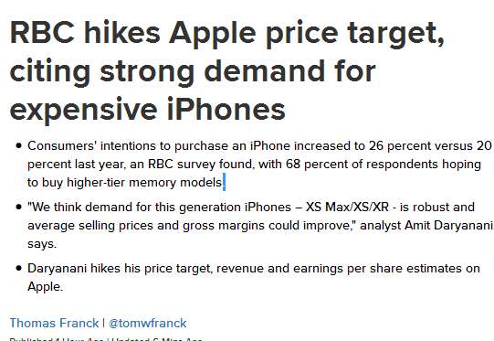 RBC(80.21, -0.46, -0.57%)上调苹果(220.42, -1.77, -0.80%)股价目标 因高价iPhone需求强劲