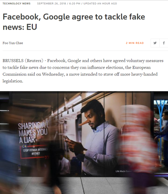 欧盟委员会周三表示,Facebook、谷歌和其他公司已同意采取自愿措施来处理假新闻,因为他们担心这些新闻会影响选举,此举旨在避免更严厉的立法。