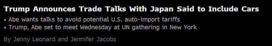 安倍和特朗普在联合国大会上见面;三位知情人士表示,特朗普计划宣布与安倍举行双边贸易谈判的框架。根据一位人士透露,贸易谈判据称包括汽车。随后,美国贸易代表莱特希泽称,美日贸易协定将需要国会批准,将在TPA“快车道”授权下启动。