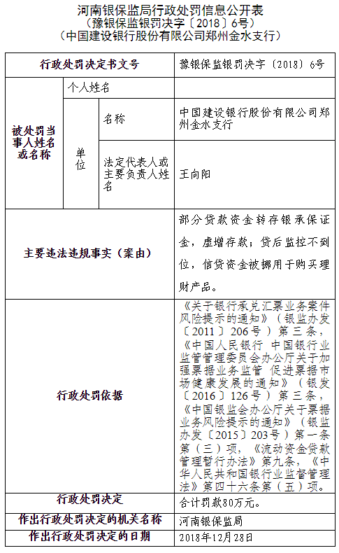 建行郑州金水支行被罚80万:虚增存款 贷后监控不到位