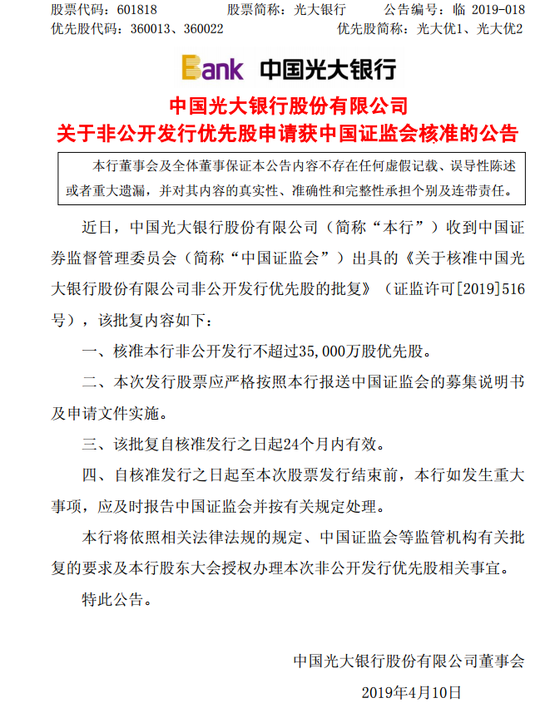 光大银行:本行非公开发行不超过3.5亿股优先股已核准